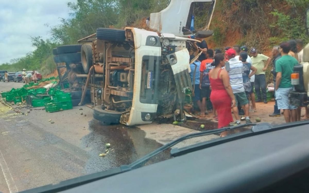 Um caminhão que transportava mangas tombou no fim da manhã desta terça-feira (30), na Curva da Galinha, trecho da Serra do Tombador, na BR-324. O acidente provocou a mobilização de equipes de resgate e despertou a atenção de motoristas que passavam pelo local.