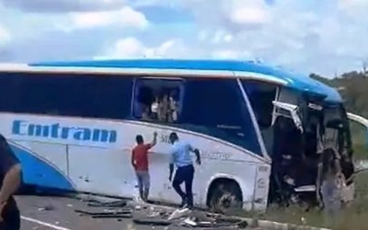 Um acidente registrado no final da manhã desta sexta-feira (28) em um trecho da BR-324 Norte no município de Tanquinho, no Portal do Sertão, deixou duas pessoas mortas e várias feridas. A colisão frontal envolveu um caminhão baú e um ônibus da Viação Entram depois do posto Trevo.