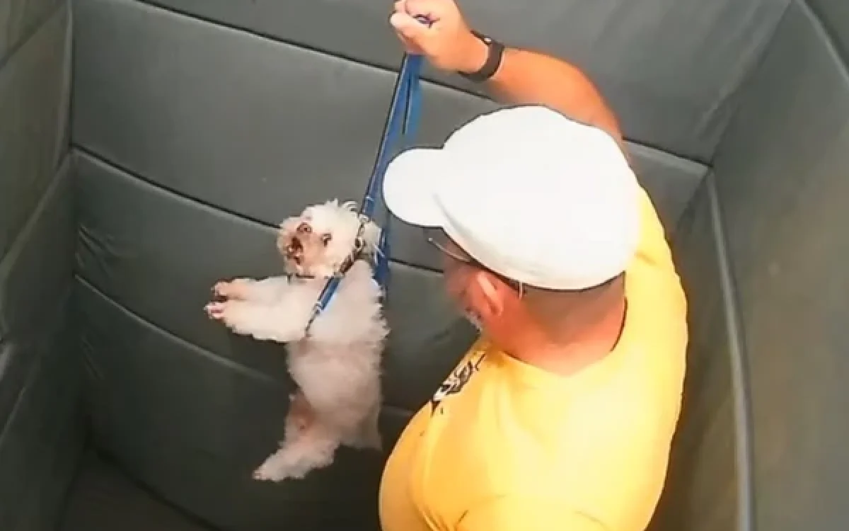Nas imagens, o homem aparece no elevador com dois animais, que estão presos às respectivas coleiras. Poucos segundos após entrar no local, ele se abaixa e começa a agredir um dos cães.