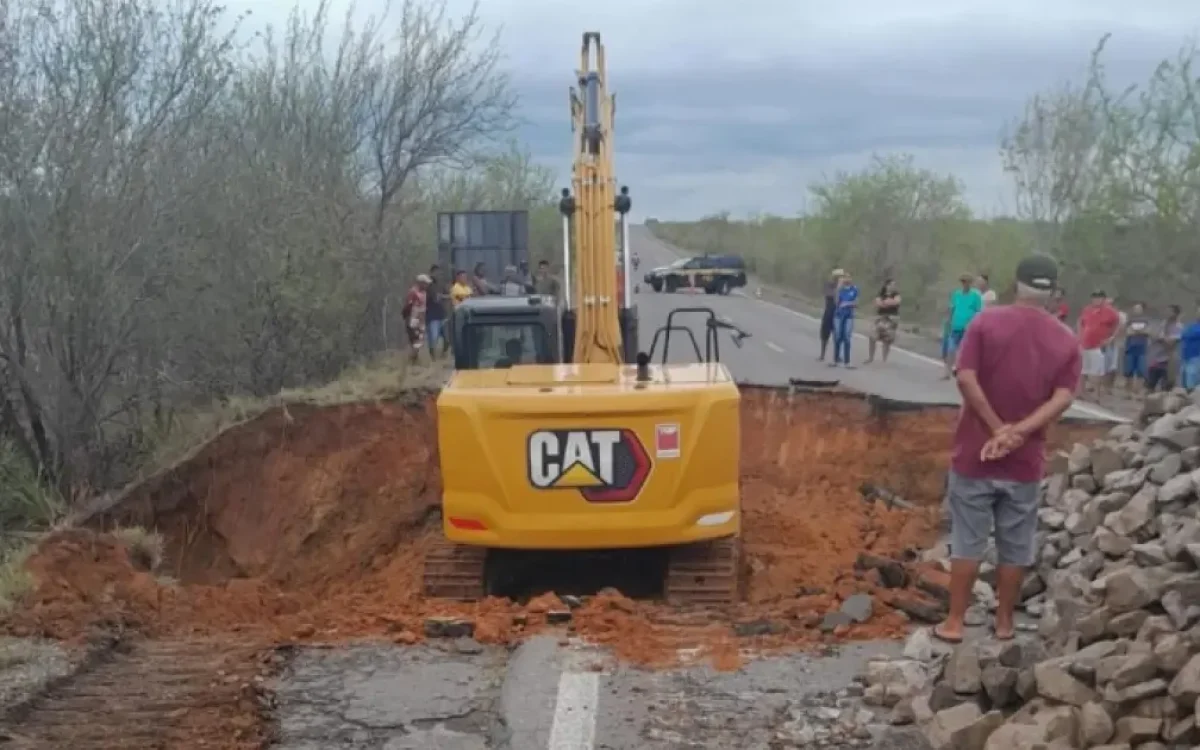 De acordo com o Dnit, as fortes chuvas que atingiram a região causaram o carreamento de material que obstruiu a vazão do bueiro existente no local. A situação resultou no rompimento do corpo do aterro no km 296.